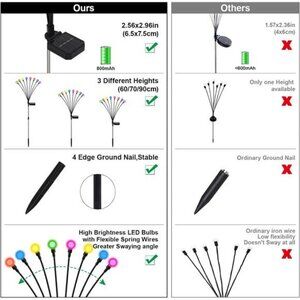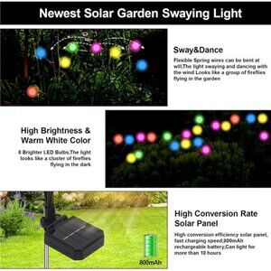 【New Generation - Better Swinging Effect】Solar firefly lights are supported by highly elastic and soft wires, each light has 8 bright LED bulbs, when the wind blows, it looks like a cluster of fireflies flying around in the darkness, creating a romantic atmosphere.Packaging with exquisite color boxes.