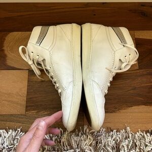 EUC pair of crisp white leather high top sneakers from the brand Swear London. These are a EU size 43. There are some minor signs of wear around the front of the toes as pictured. No other stains or flaws!