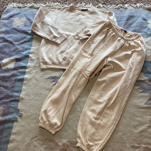 Boohoo sweat set. The pants are a size 8 and the top a size 6. There is some pilling from the wash. This is a beige/ cream color