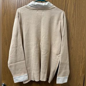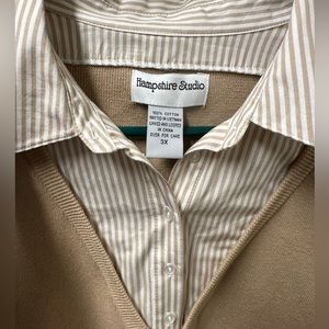 Hampshire Studio sweater. Ladies size 3X. V-neck tan sweater with sewn in button collar and cuffs to give it a layered look. Very comfortable without feeling bulky. Perfect for office or casual wear. Excellent condition - this was washed and worn only once, so it’s like new. Measures 26” pit to pit, and 28” back of neck to hem. Smoke free home. Bundle for savings. (#405-A)