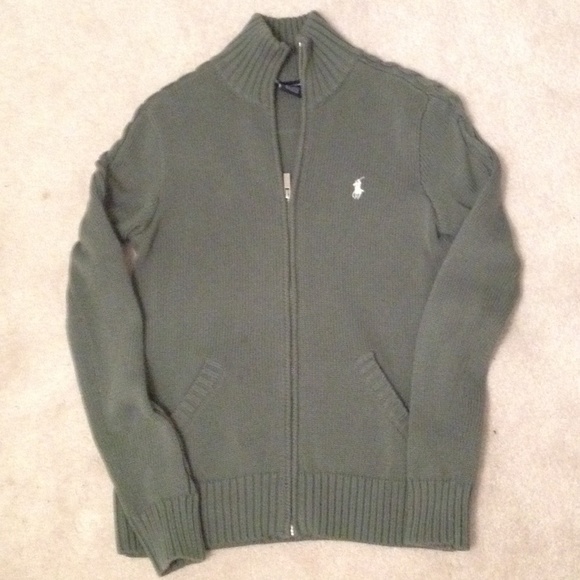 Ralph Lauren Sport. Green, heavy sweater. Heavy duty zipper. Tiny pull of a loop in the front.