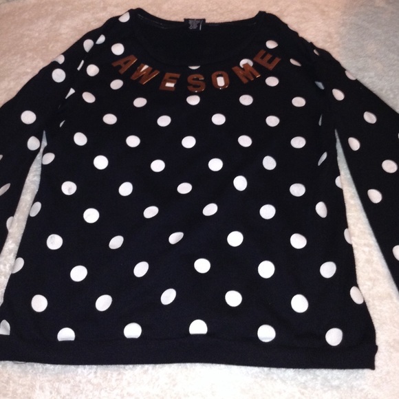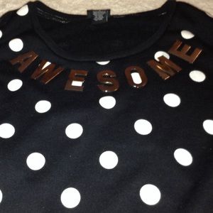 This is a all black sweater with white polkadots and letters at the top which spells out "AWESOME" .