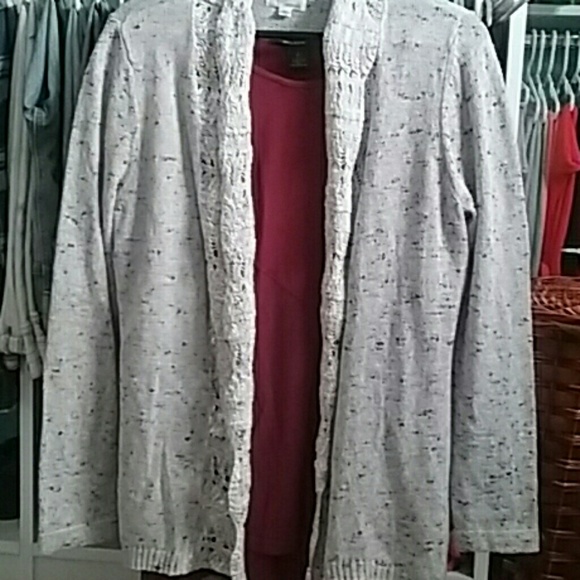 It is grey in color and has different color specks thru out bought to wear over burgandy top