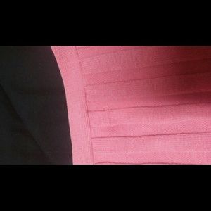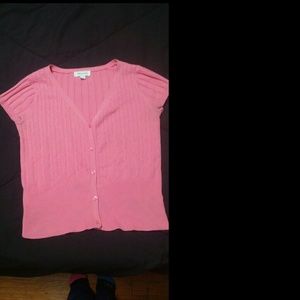 This lightweight, short sleeved sweater is a soft but bright pink. It is a comfy xs that fits more like a small that runs a little larger to size. I wore this sweater in college and it must move out of its mothers house before it turns 30!