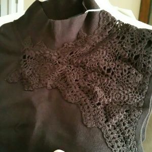 Mock neck sweater with crochet detailing. Brown