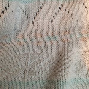 White shirt sleeve sweater with faint pink and light blue striping.