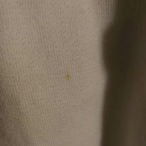 Wore once, small size stain in the front, smoke free, pet free, very clean home