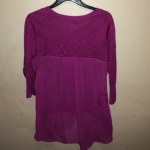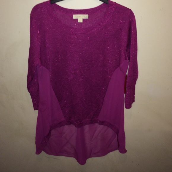 Pink, sweater material is sparkly , the back is more of a sheer blouse material, new never worn , still has tags, minor stains on the back ( check picture) super cute