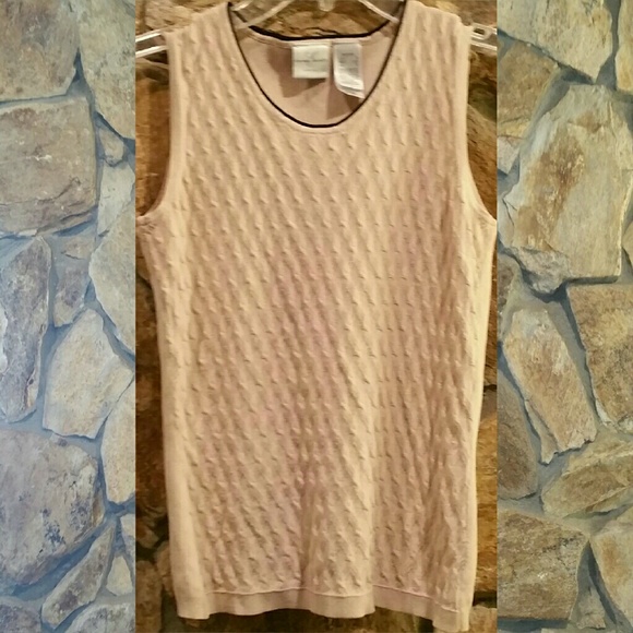 Sweater, sleeveless, peach neckline with black trim, 64% rayon, 36% nylon,