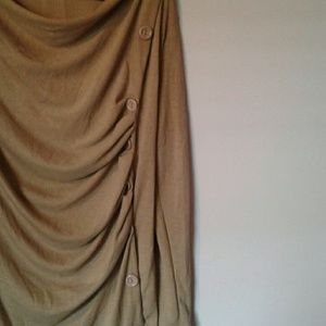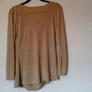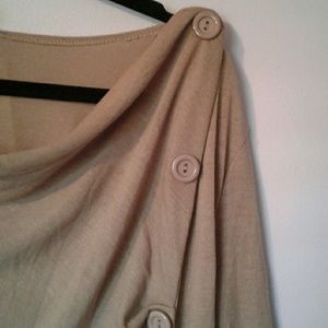 Great lightweight sweater. Ruching is superflattering. Have this in 3 other colors,but khaki doesn't work for me. Buttons are attached, don't open. 65% polyester. 17 inches shoulder to shoulder. 29 inches long.