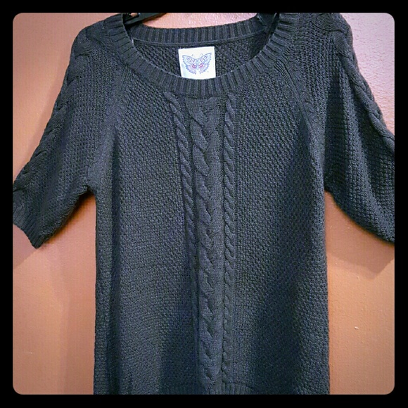 3/4 sleeves knit dark gray high-low hem sweater, round neck collar.