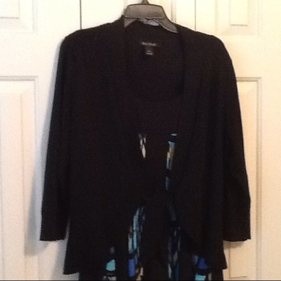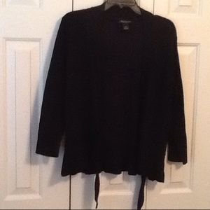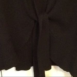Lightweight sweater that ties in the front. Slightly ruffled bottom. Very slenderizing. Goes great over any sleeveless dress. Ties in front. Hard to see from pic how cute it is!