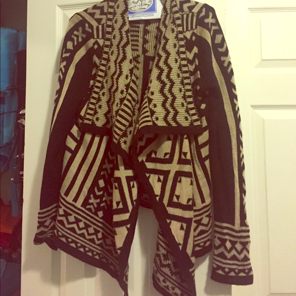 This is an open sweater with a pattern on it and an extended collar