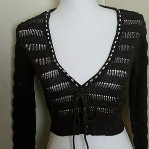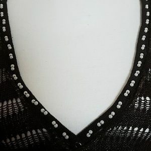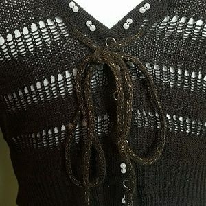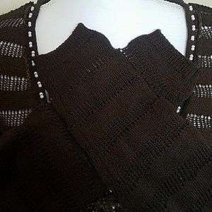 Woven brown sweater with beads on neck and brown and gold string. Slight snag on the inside area near tag