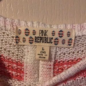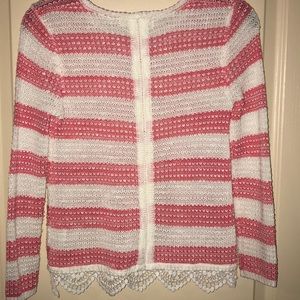 Adorable sweater with lace detail at waist. Cream and coral with just a touch of silver.
