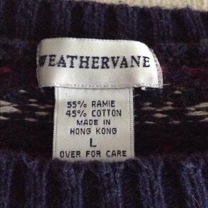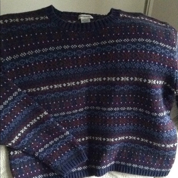Multi print blues, green, white and maroon cotton sweater. Sits at hip. Oldie but goodie. Large but not too large. The days when large was true to fit. Machine washable. Very durable sweater.