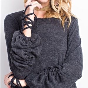 Tie-up charcoal scrunch sleeve tunic sweater.