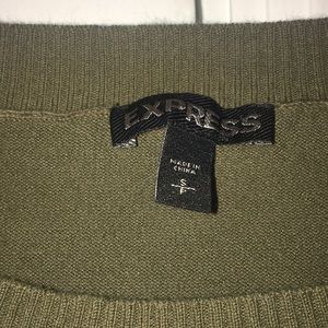 Olive green and gold sweater 74% cotton 26% nylon . Stretches and form fitting looks great with jeans leggings or even a skirt .