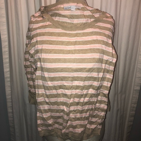 Light pink, tan, and white striped sweater, scoop neck, 3/4 length sleeves