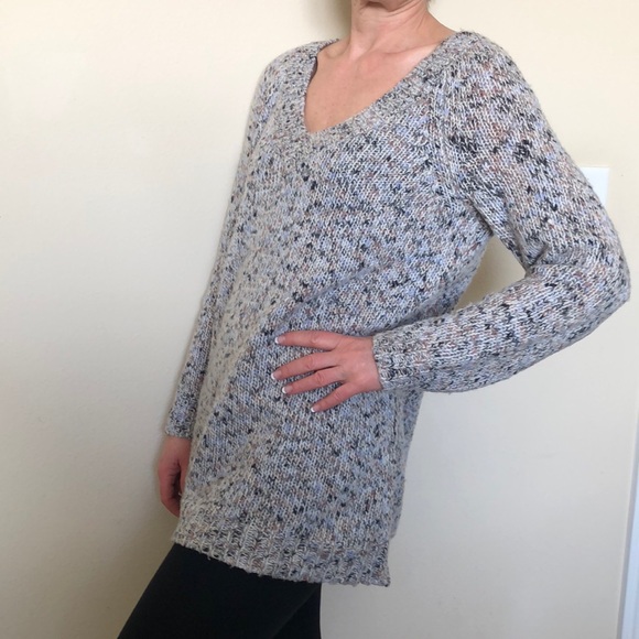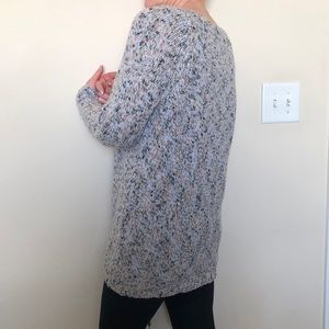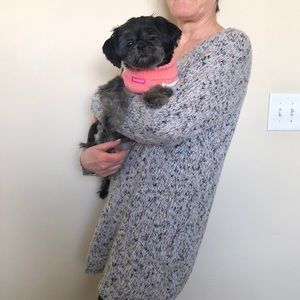 Tunic style sweater. A few colors woven throughout - black, tan, light purple. The base color is ivory. Very cozy & soft. Cotton, nylon, acrylic, wool, angora, makes hair. Puppy not included :).
