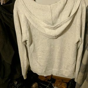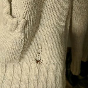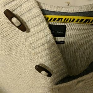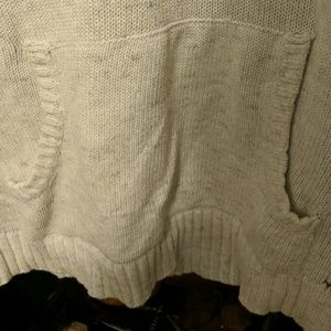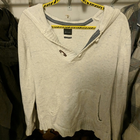 Super comfy sweater, great for beach bonfires Front pocket and large wood ties Small infraction in front bottom