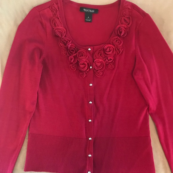 Deep red cardigan sweater with rosettes