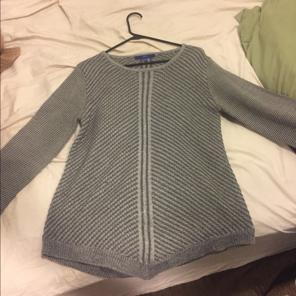 Gray sweater - worn once. Not my style. Size L. Goes to about your butt area. Thick. And soft.