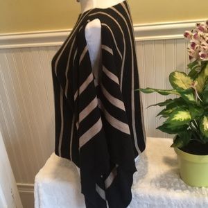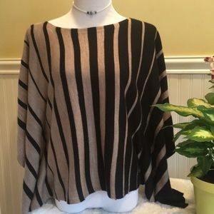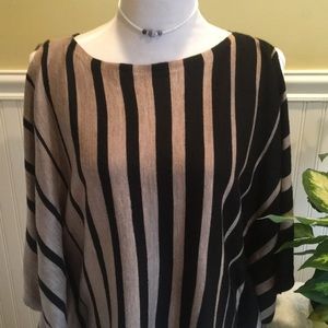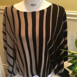 Cold Shoulder - very cute , boutique sweater - flattering stripes of black and taupe - full draping sleeves