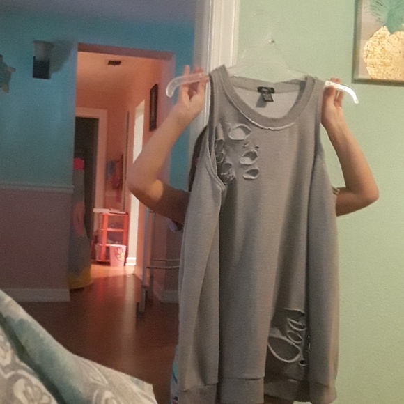 Cut out shoulder. Small spot on the front. Looks like a grease spot. It should come out with a proper wash for that kind of stain.