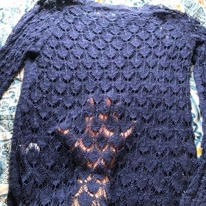Blue sweater with flower see through on back see pictures. No issues. Size small.