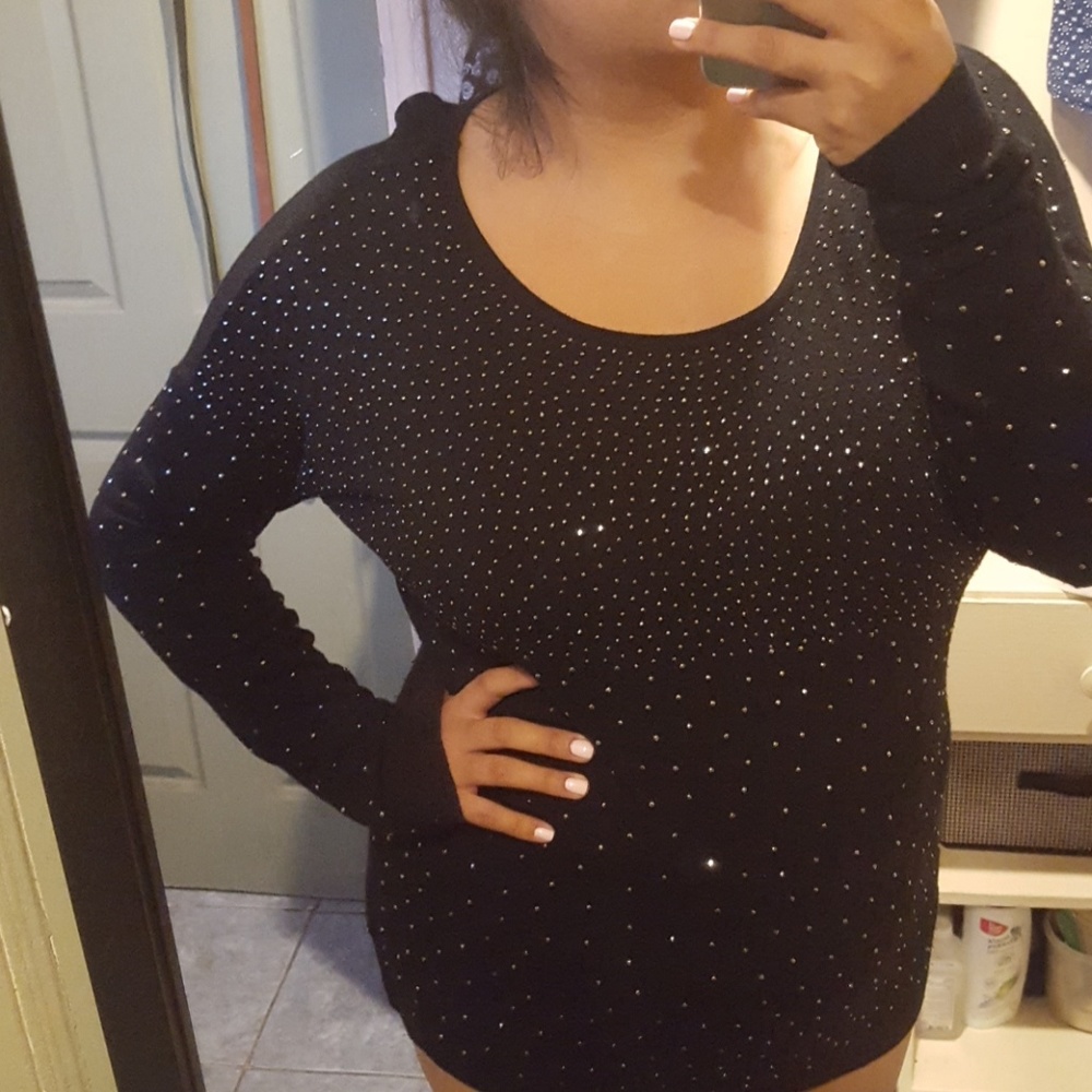 Black long sleeve beaded sweater. Used. Has a hole on the the back because I removed the tag.