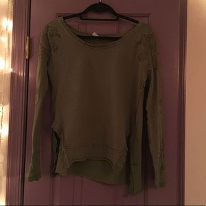 Long sleeve army green sweater with lace sections on sleeve and the back and sides have a cut out