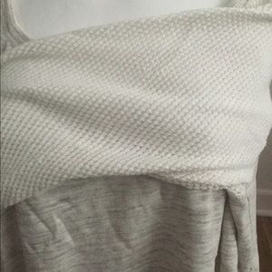Super cute sweater that is perfect for fall. Raglan style sweater with a heathered light gray with and cream sleeve.