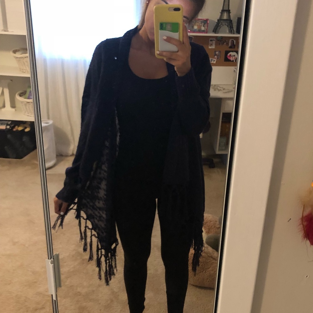 Navy blue cardigan with tassels at the bottom. Very cute, navy blue color. Bought from Charming Charlie’s!