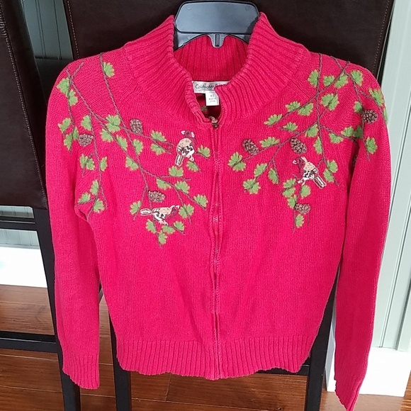Zippered with pine cone pull, red with birds and branches. Embroidery is wool and has gotten fuzzy. No stains or holes. Non pet, non smoking home.