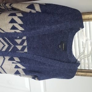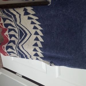 Sweater with tribal marks as a design, colors are blue, beige and red