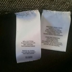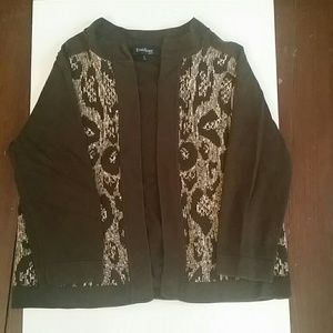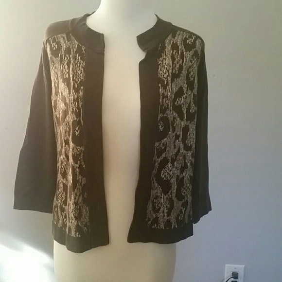 Brown sweater with brown and tan patter on front, no holes or discoloration, very soft, cotton/rayon, cardigan without buttons, petite large