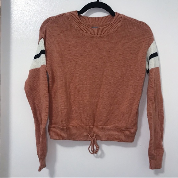 Cropped sweater with drawstring waist detail and cute collegiate stripes on sleeve