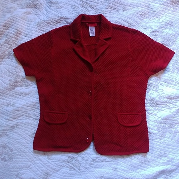 Short sleeve chevron pattern textured dark red sweater. What looks like buttons are actually snaps.