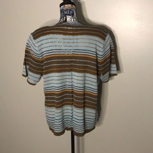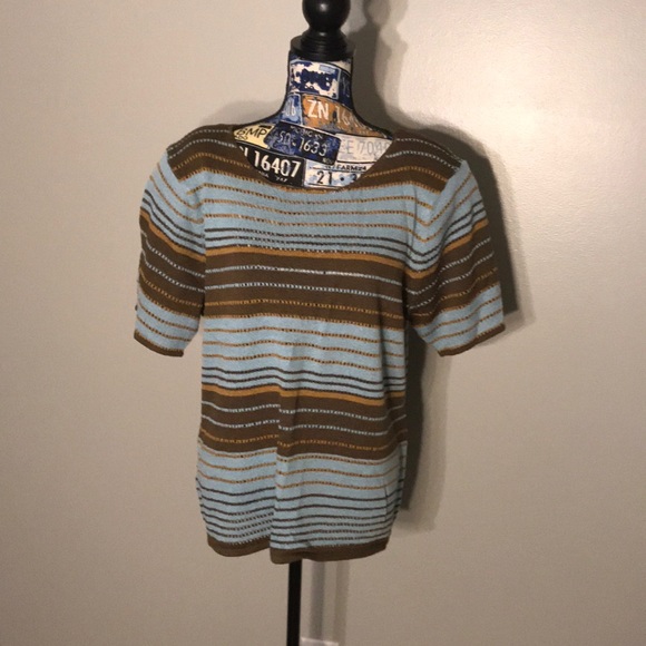 Lightweight short sleeve sweater. Tan, brown and light blue.