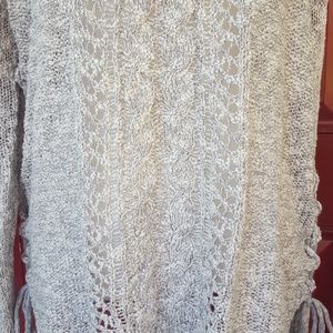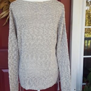 Oatmeal in color sweater with lace up detail on both sides that can be adjusted. 100 percent acrylic