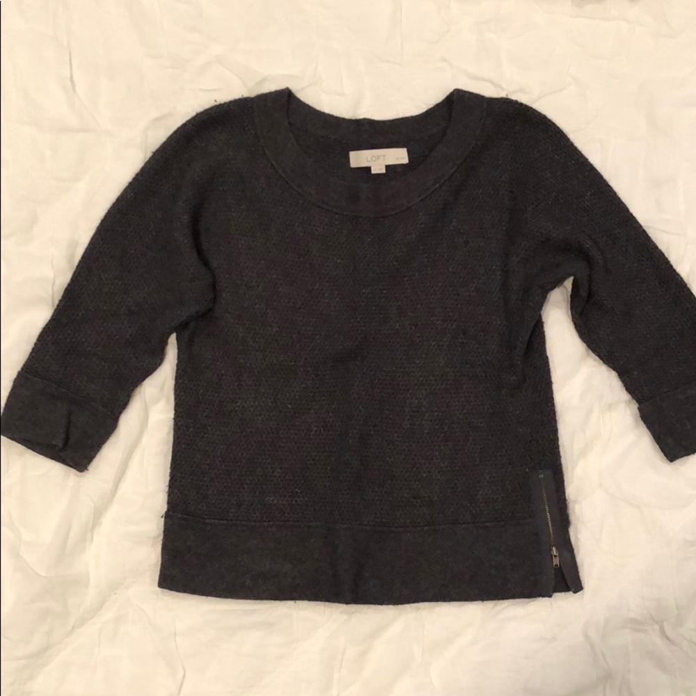 This 3/4 sleeve sweater is charcoal grey and has only been worn a handful of times. Although a couple of years old, it’s in great condition. It’s a blend of rayon, wool, nylon, and cotton.