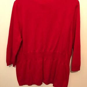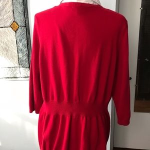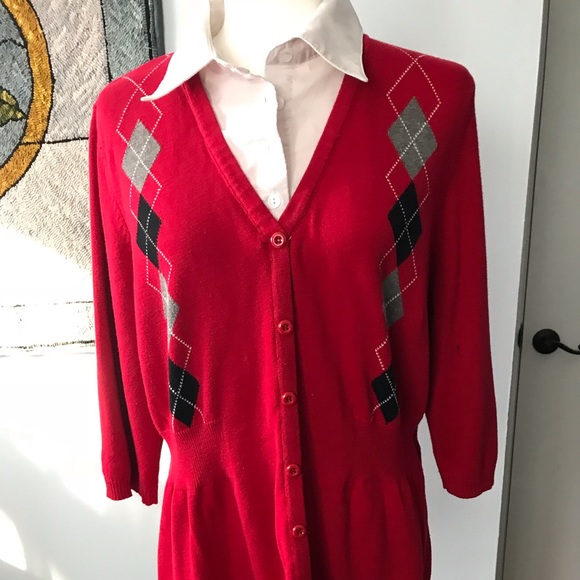 Cute red sweater with faux blouse and argyle detailing, loose gathering at waist