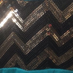 Turquoise sweater with black and gold sequin detailing on the shoulders and lower back on the left right upper pocket area the size says a large but I’m a small medium... runs small