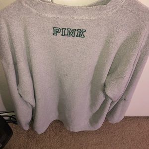 Pink Brand Silver Sweater with Green Spartan Letters written across