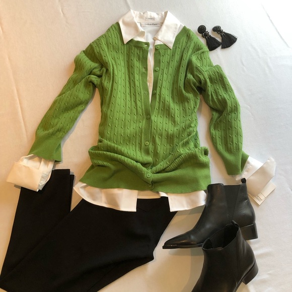 Button front sweater. Can be worn alone or as a cardigan with shirt underneath.