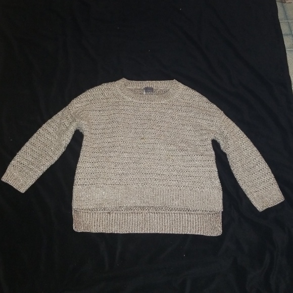 White and Gold sweater. Sleeves are 3 quarter. Front is higher than the back.