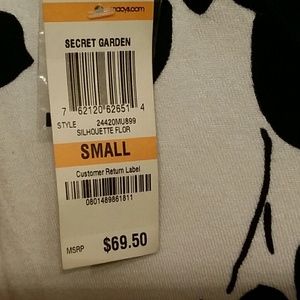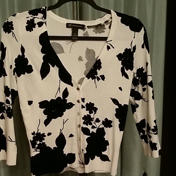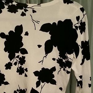 Black floral pattern on off background with subtle beading on front. Three-quarter length sleeve with rhinestone buttons. Under arm to under arm is 34 inches flat