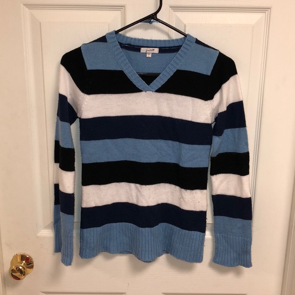 Unisex kids v-neck sweater. Two inch stripes. White, navy, cornflower blue. Soft and cozy.