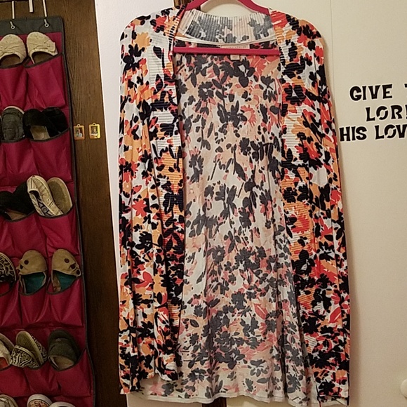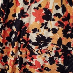 Cozy sweater, perfect for fall or spring. I absolutely love this sweater, but it's unfortunately too big now :( the pattern is light orange, dark orange, navy, and white.